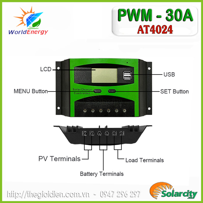 - Bộ điều khiển sạc năng lượng (Solar Charge Controller PWM) tích hợp màn hình LCD hiển thị dòng sạc Ah, điện áp PV, điện áp bình, trạng thái sạc, nhiệt độ...