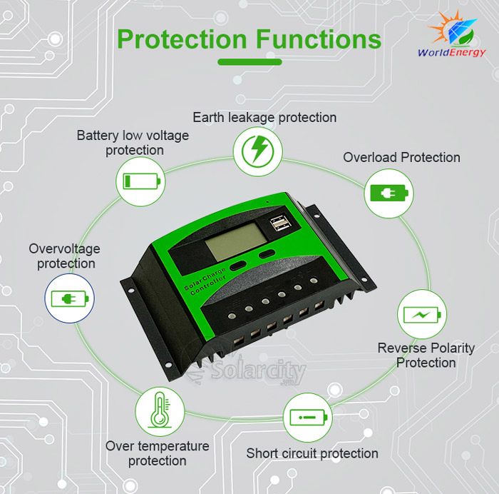 - Có chức năng bảo vệ: quá áp, quá tải, ngắn mạch, ngược cực