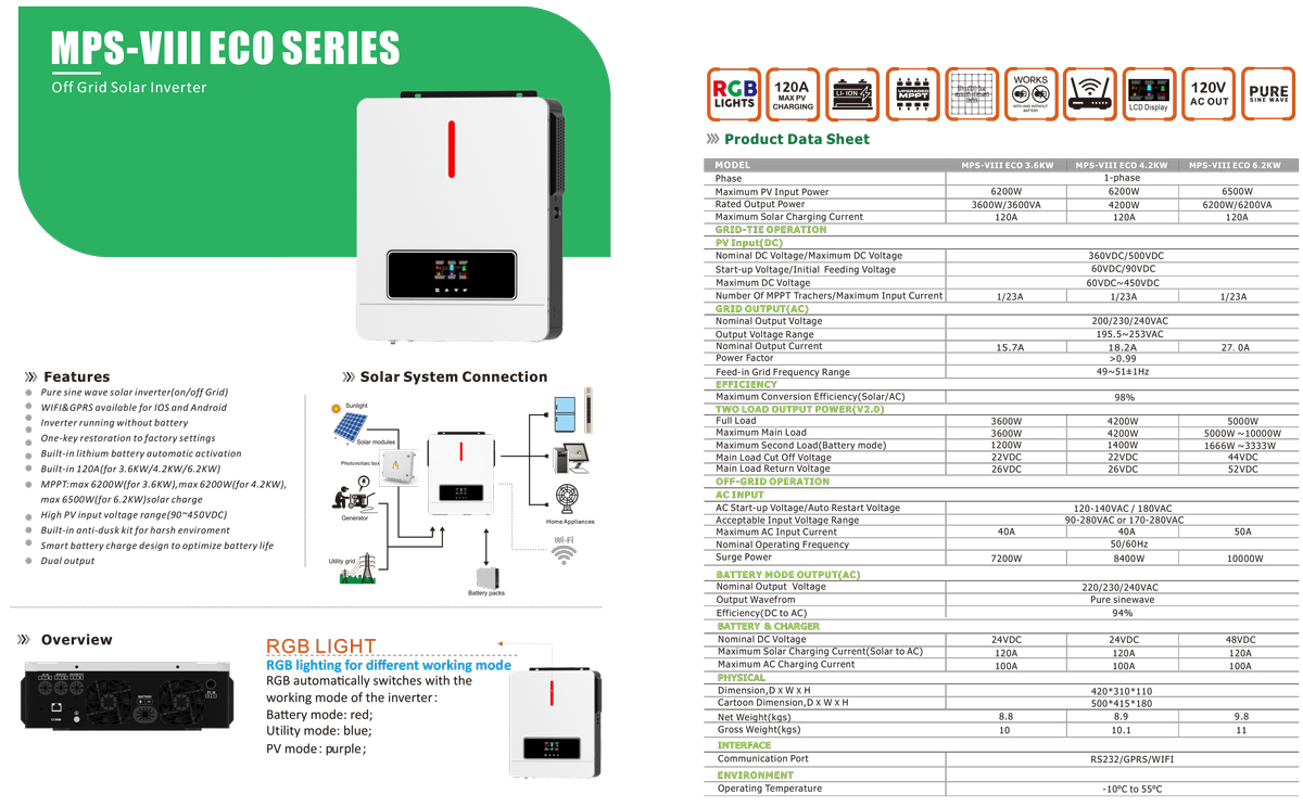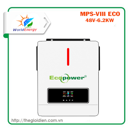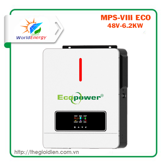 - Inverter Hybrid Ecopower MPS-VIII ECO 6.2KW là biến tần có đầy đủ chức năng của một Inverter hoà lưới và Inverter độc lập: Hòa lưới, bù lưới, hòa lưới có dự trữ (kết hợp với pin/acquy), chạy độc lập.