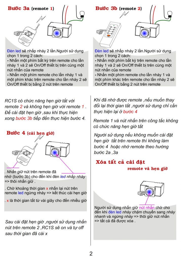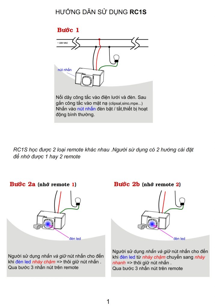 – Lắp đặt và sử dụng công tắc tắc điều khiển từ xa RC1S vui lòng xem các hình sau: