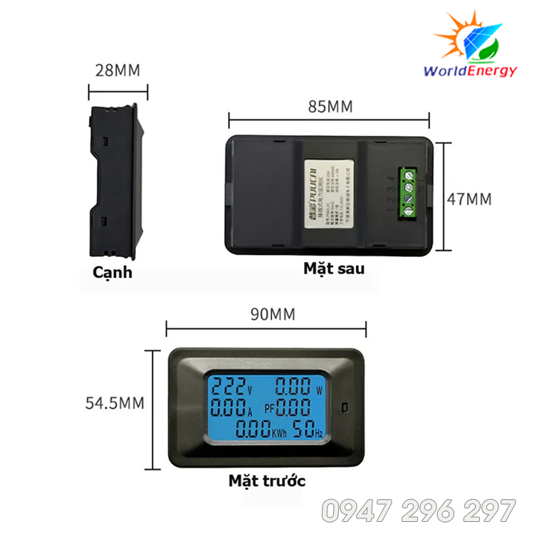 * Thông số kĩ thuật Đồng hồ đo công suất AC 100A hiển thị 6 thông số A, V, W, KW, Hz, Cos φ