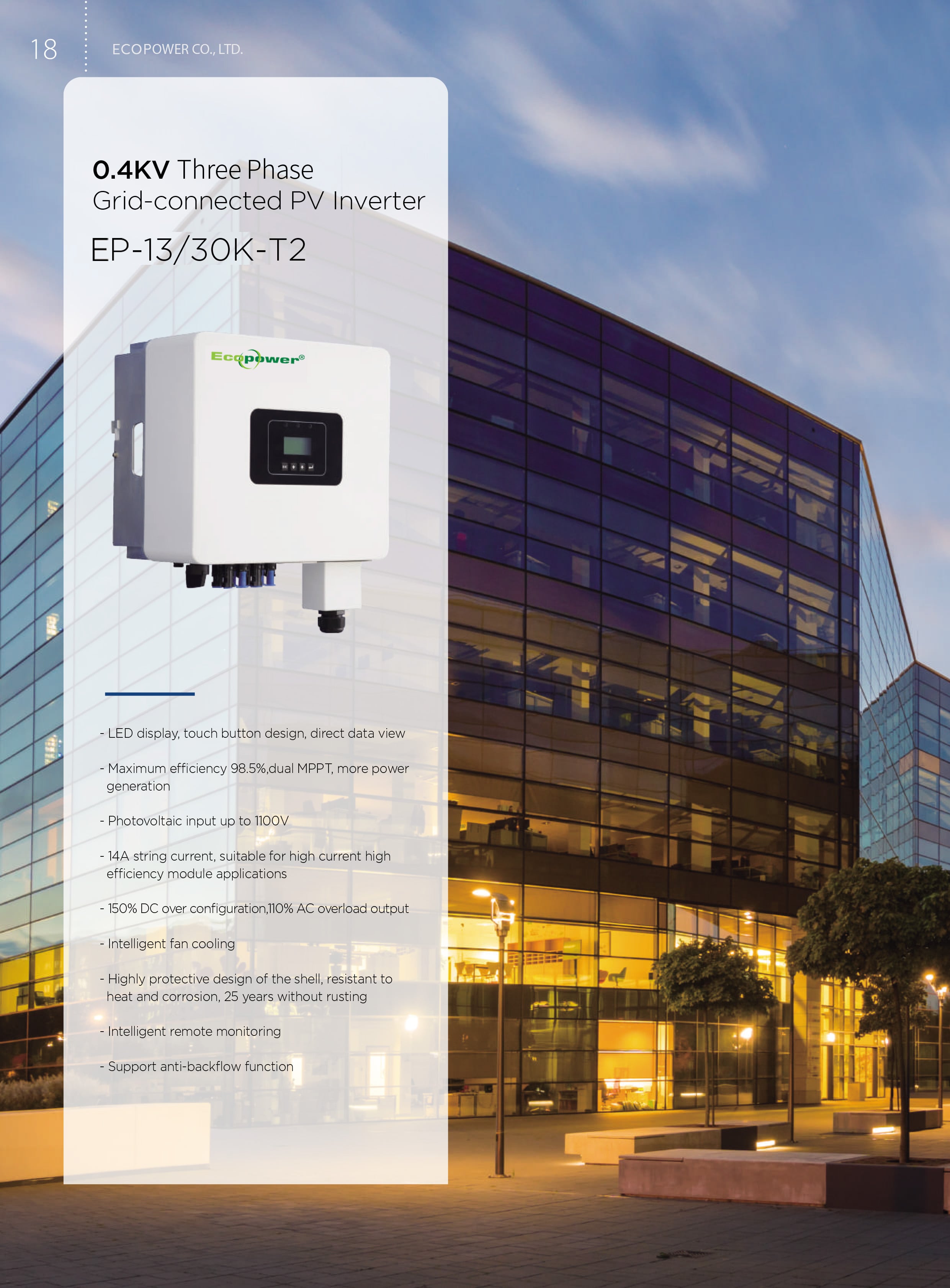 Inverter Hòa Lưới Ecopower 15KW 3 pha (EP-15K-T2) được thiết kế cho các dự án dân dụng và thương mại ba pha
