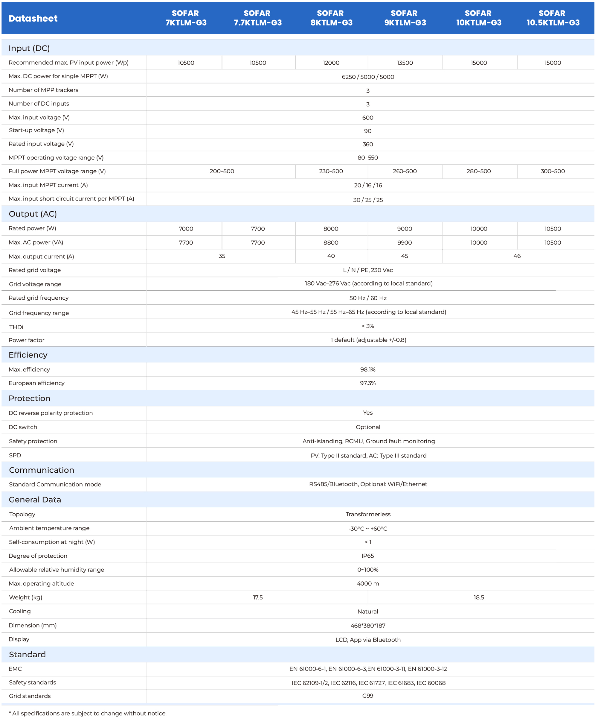 Thông số kỹ thuật Inverter hoà lưới Sofar Solar 10.5KW (10.5KTLM-G3)
