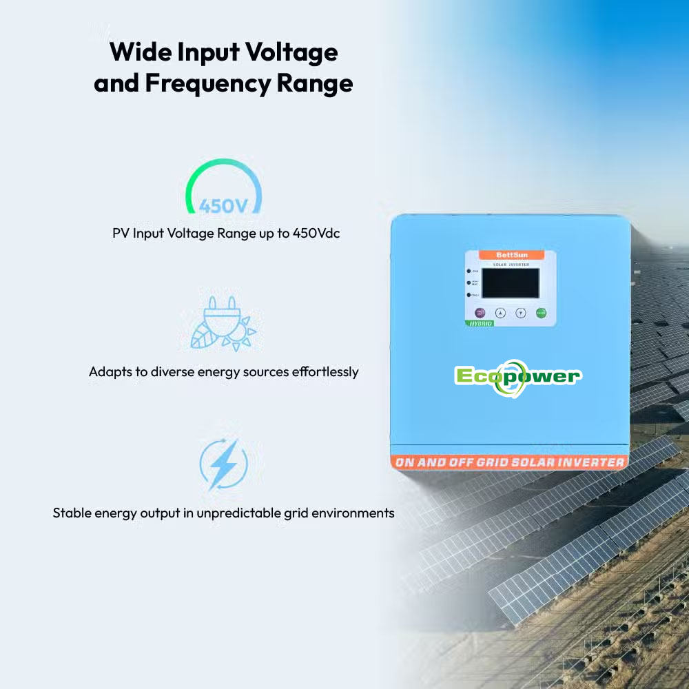 Biến tần Ecopower 6KW 48V hoạt động trong dải điện áp đầu vào PV từ 110-450Vdc, là lựa chọn lý tưởng cho các khu vực có độ ổn định lưới điện biến động cao. Biến tần thích ứng mượt mà với điều kiện điện áp biến động, đảm bảo hoạt động liên tục.