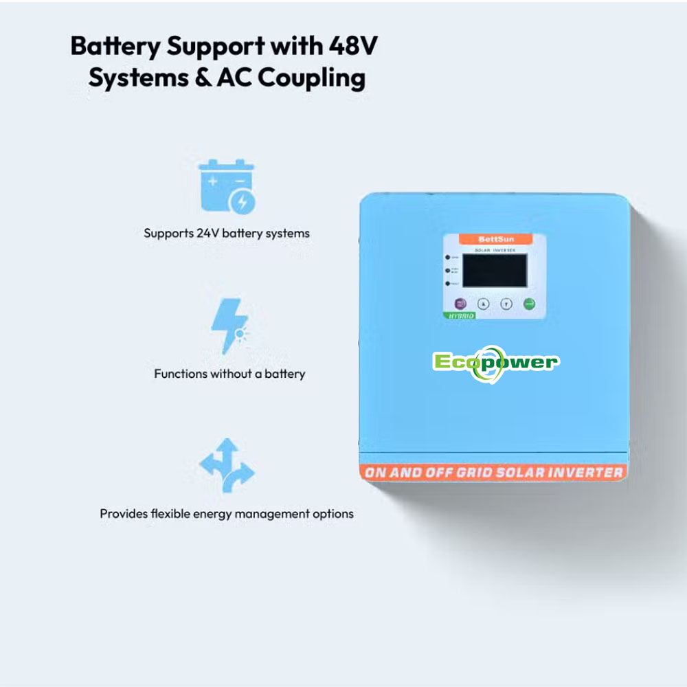 Model 6KW 48V này hỗ trợ vận hành hòa lưới, độc lập và lai, mang đến giải pháp toàn diện cho các nhu cầu năng lượng đa dạng. Tính linh hoạt của nó đảm bảo cung cấp điện liên tục trên nhiều nguồn năng lượng và cấu hình khác nhau.