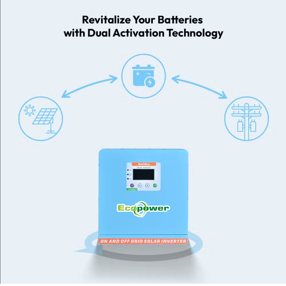 Được trang bị tính năng kích hoạt kép, Ecopower BS 6KW 48V có thể kích hoạt lại pin lithium-ion đang không hoạt động bằng năng lượng mặt trời hoặc điện lưới, đảm bảo sử dụng pin hiệu quả và độ tin cậy lâu dài.