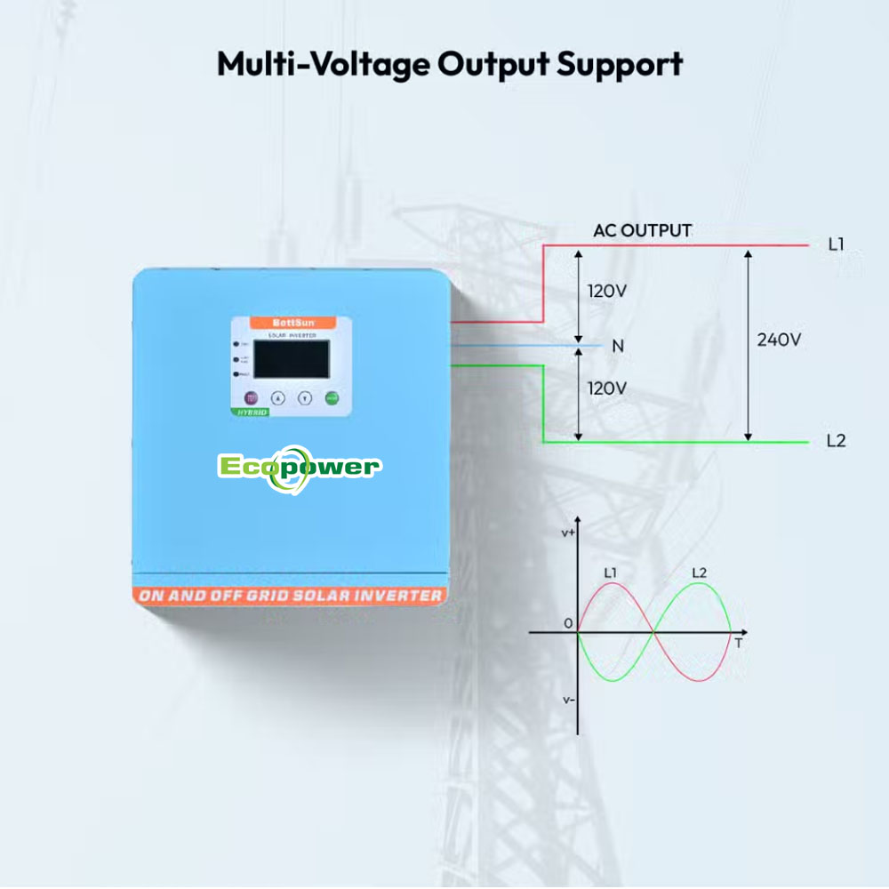 Mẫu 6KW 48V hỗ trợ đầu ra 208Vac, 230Vac và 240Vac, giúp sản phẩm có thể thích ứng với nhiều tiêu chuẩn lưới điện địa phương và mang lại sự linh hoạt trong lắp đặt và sử dụng.