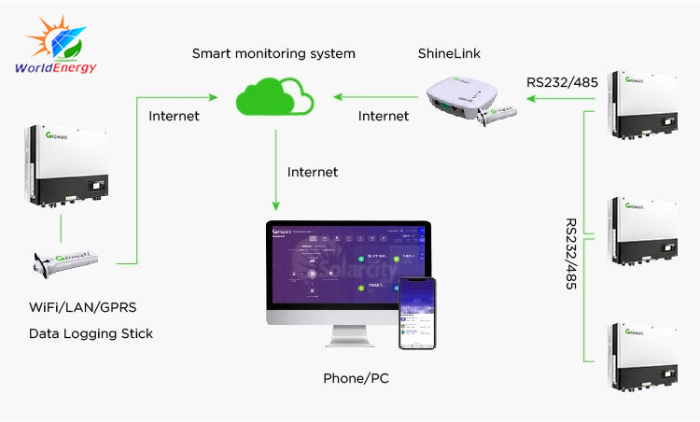 - Giám sát cài đặt và nâng cấp từ xa qua điện thoại và máy tính (Web) thông qua RS485 / WiFi / GPRS / Ethernet / CAN2.0