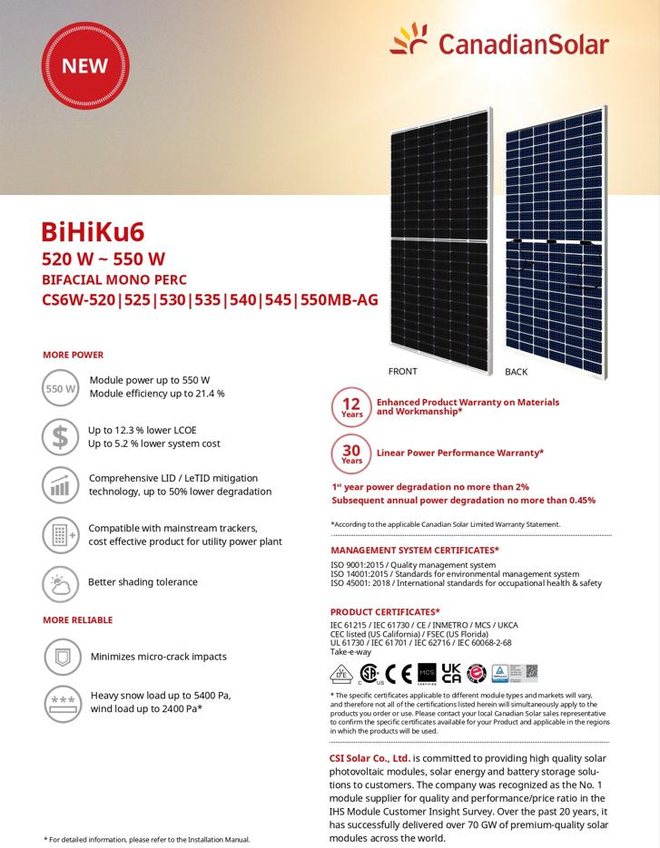 * Chứng chỉ an toàn, chất lượng Tấm pin năng lượng mặt trời Mono Canadian Solar 550W (CS6W-550MB-AG)