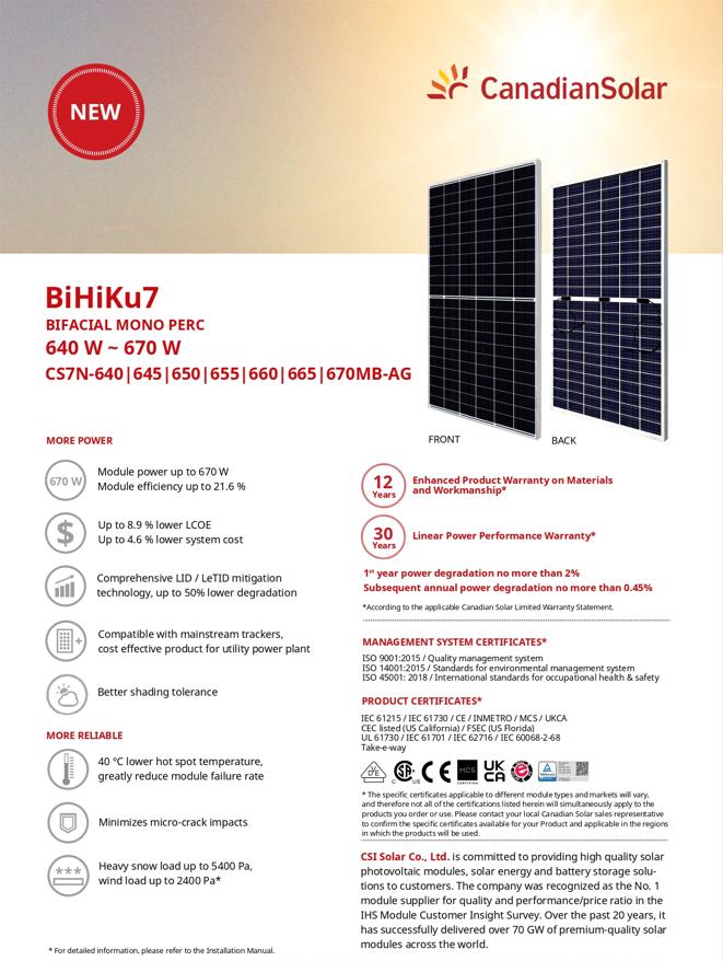 * Chứng chỉ an toàn, chất lượng Tấm pin năng lượng mặt trời Mono Canadian Solar 670W (CS7N-670MB-AG)